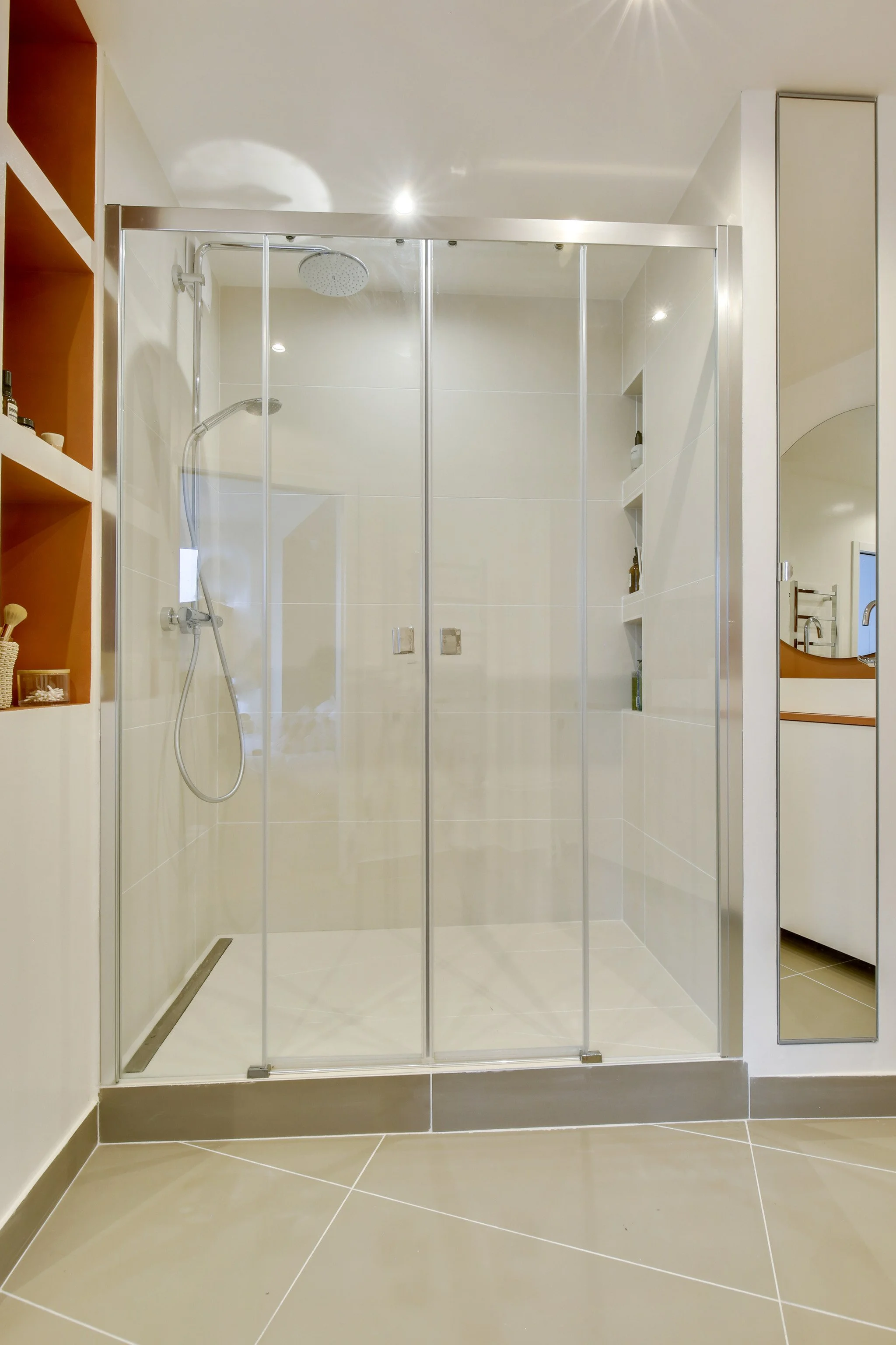 First the spacious terracotta ensuite bathroom with a large walk-in shower, toilet and double sink. The bathroom can be reached through a sliding door from the master bedroom.