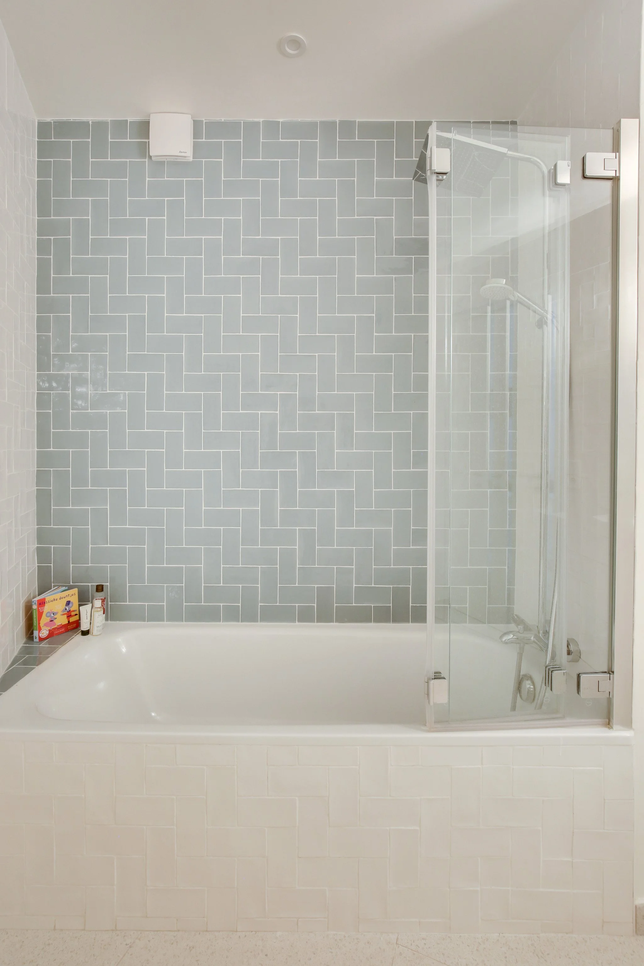 The second children’s bathroom has soft blue tones and has a bathtub and a single sink. A changing table is available as well as pots and bath toys for the little ones.
