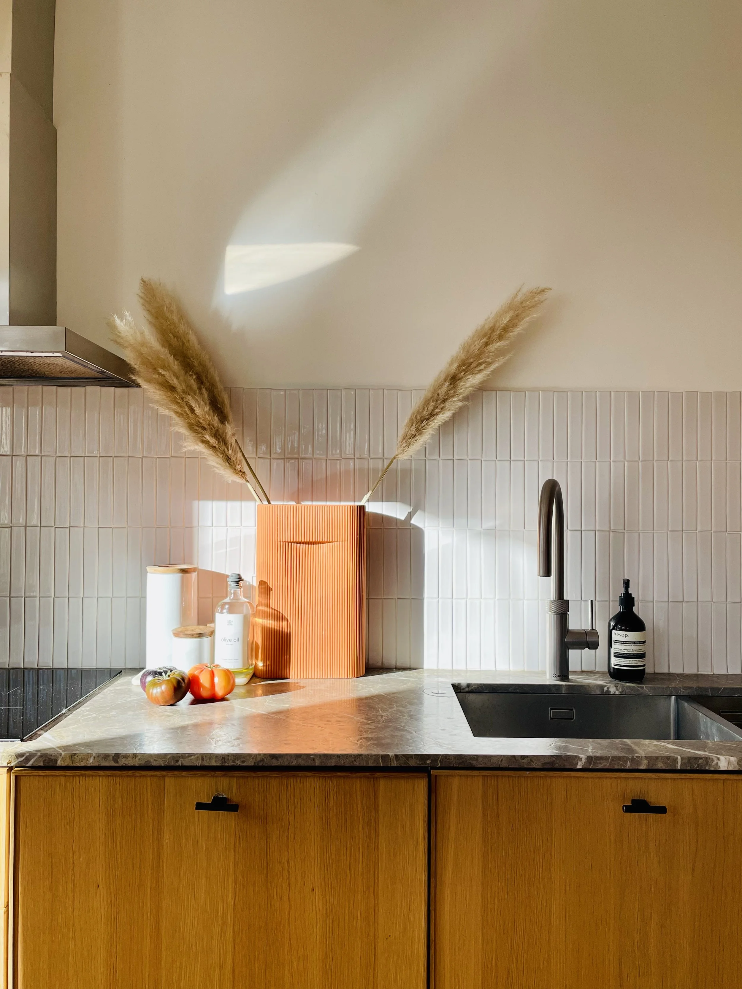 The kitchen is the place where we gather around the marble bar for a coffee, tea or drinks. The kitchen is fully equipped with quality standard equipment as well as a Quooker and a wine cellar. The cupboards are full with spices, oil, and the basics you need to cook. The warm colour palette contrasts with the black wall and the soft tones of the marble.